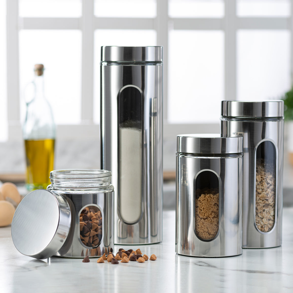 Details: Ler'aze 4-Piece Red Stainless Steel Canister Set offers a storage solution suitable for every kitchen, pantry, or any room of the home. The set features narrow uniform glass cylinders encased in stainless steel. The glass viewing window beautifully showcases what is being stored, making it easy to identify contents. The uniting of these two durable materials provides added durability and stability making these canisters perfect for everyday use. The 4-Piece Red Stainless Steel Canister Set comes in four sizes: 64-ounces, 46-ounces, 36-ounces and 24-ounces. These slender modern canisters look great lined up on your counter top or grouped together for saving space, conveniently storing your dry pantry goods.