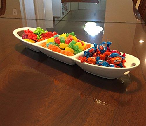 Details: Elegant Pure White Relish Tray 3 Section Divided Bowls Server, with Handles, Buffet Server for Candy, Nuts and Dips. 3-Section Dip and Condiment Server, Oval Divided Serving Dish