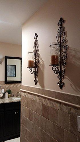 Details: Elegant design Made from wrought iron in a scroll design. Holds votives or pillar candles. Attractive hurricane candle holders will turn your empty space into a beautiful lighting display! This sconce is 29" long, 7" wide and 5" deep. Holds a 3" candle. Glass section is 8 1/2" high and 3 3/4" wide Adds a touch of luxury design excellent decorative accent for any type of decoration. These are gold with a dark brown brushed over An antique look. Wonderful gift for friends and family. Great gift idea for new homeowners.